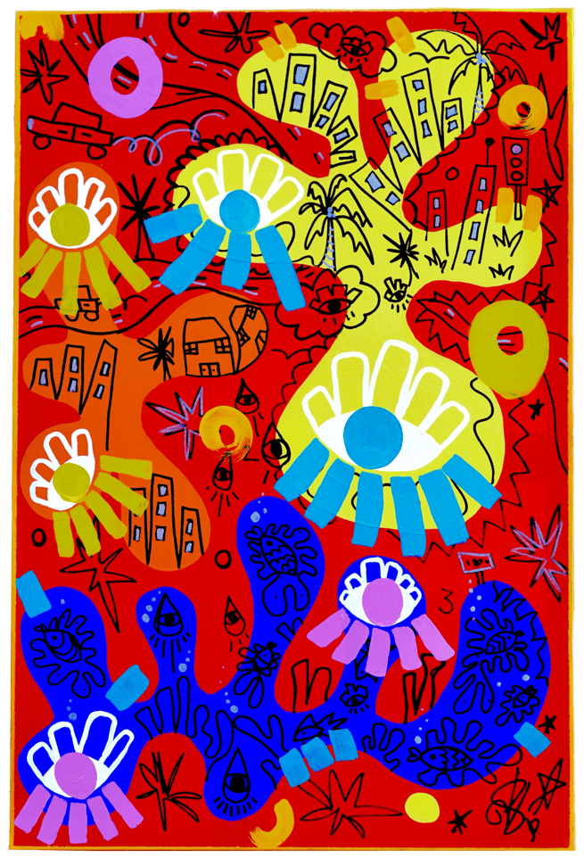 Rickards’ process unfolds as a visual deconstruction of the human form. She begins with fluid, distorted bodies that converge to reveal hidden faces. Over time, these forms dissolve further into figures without identifiable bodies, reflecting a fragmentation of self and a rejection of the physical ideal. From these broken forms, she constructs cities, compositions that reassemble the human presence into a collective sense of place and belonging. Through this transformation, Rickards reimagines community as an interwoven tapestry of the human spirit rather than the human body. Rickards’ work celebrates community, happiness , and her gratitude for life, transforming her memory into colorful and symbolic compositions.