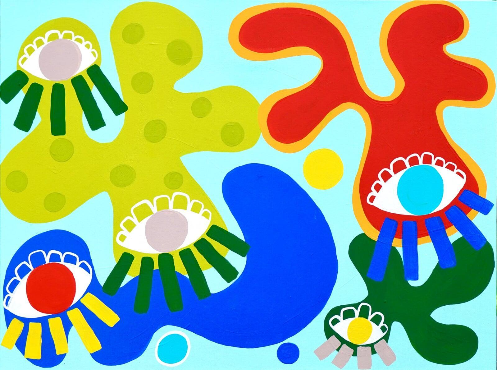 Her paintings function as sites of reconstruction, where remembering becomes an active process of layering, obscuring, and revealing. Working in acrylic, she builds surfaces through color and shifting form, allowing biomorphic shapes to emerge, overlap, and recede. Edges collide and reassert themselves, mirroring the instability of memory as something continually rewritten rather than fixed.